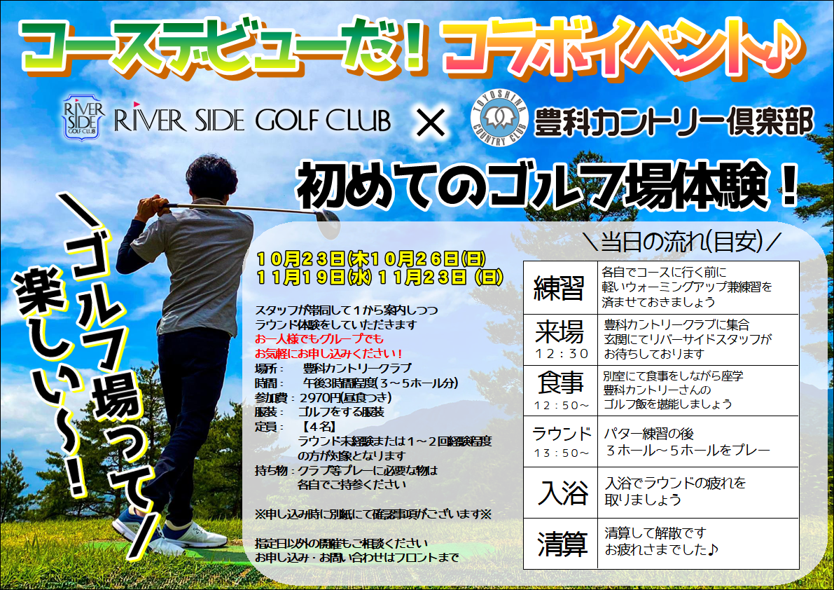 | 来場 12:30 | 豊科カントリークラブ集合 玄関にてリバーサイドスタッフがお待ちしております |
